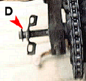 Wenn du auf der Gegenseite, die Achse (D) gut packen kannst, hälst du mit der einen Hand das RAD in der Flucht, mit der anderen ziehst du an der Achse. Sobald du den Achsbolzen draussen hast, bewegst du das Rad richtung Motor. Die Kette wird "lose" und du kannst die Kette vom Kettenrad entfernen.